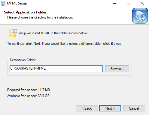 Klik op NEXT en geef in het volgende scherm de locatie op waar je MFME wilt plaatsen: