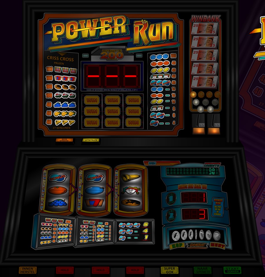 De Power Run is een fruitautomaat van Eurocoin uit 1989, met een spannend basisspel, bonuspotten en een Supergok. Manual aanwezig. Basisspel: Start met de knipperende START/GOKKEN knop. Winnende combinaties verschijnen op de winlijn; een hold kan extra kansen bieden. Prijzen worden getoond op het display en kunnen: Dubbel of niets gegokt worden Opgenomen worden via de HERSTEL/INNEN knop Ingezet worden in het Power Run-spel via NAAR SUPERMETER Bonuspotten: Bonuspotten vullen zich volgens het bonuswinpaneel. Bij 60 punten lopen ze automatisch door naar 100 punten en worden in de SUPERMETER gezet. Winbank: Prijzen t/m 100 punten kunnen in de WINBANK worden…
