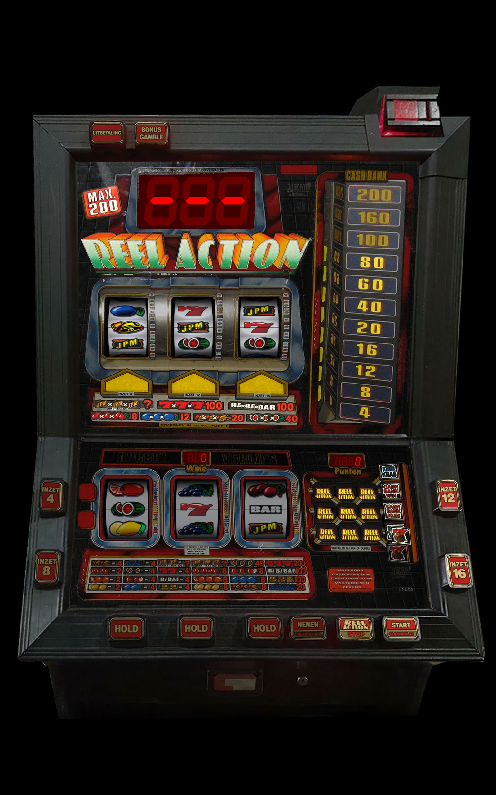De Reel Action is een fruitautomaat van JPM uit 1990 en de opvolger van Reel Magic. De kast draait op MPS2-techniek en heeft 6 brede rollen:3 voor het basisspel en 3 voor het bovenspel. In het basisspel worden Reel Action-symbolen die in beeld komen verzameld in een matrix. Volle horizontale of diagonale lijnen activeren features, zoals kris-kras wins, cash bank, mystery win en 7 telt voor elk symbool. Bij meerdere actieve features mag de speler zelf kiezen welke wordt gespeeld. Verlichte symbolen vervallen na een win, dubbel of feature. Winsten kunnen worden ingenomen, gegokt of ingezet in het bovenspel. Dit…