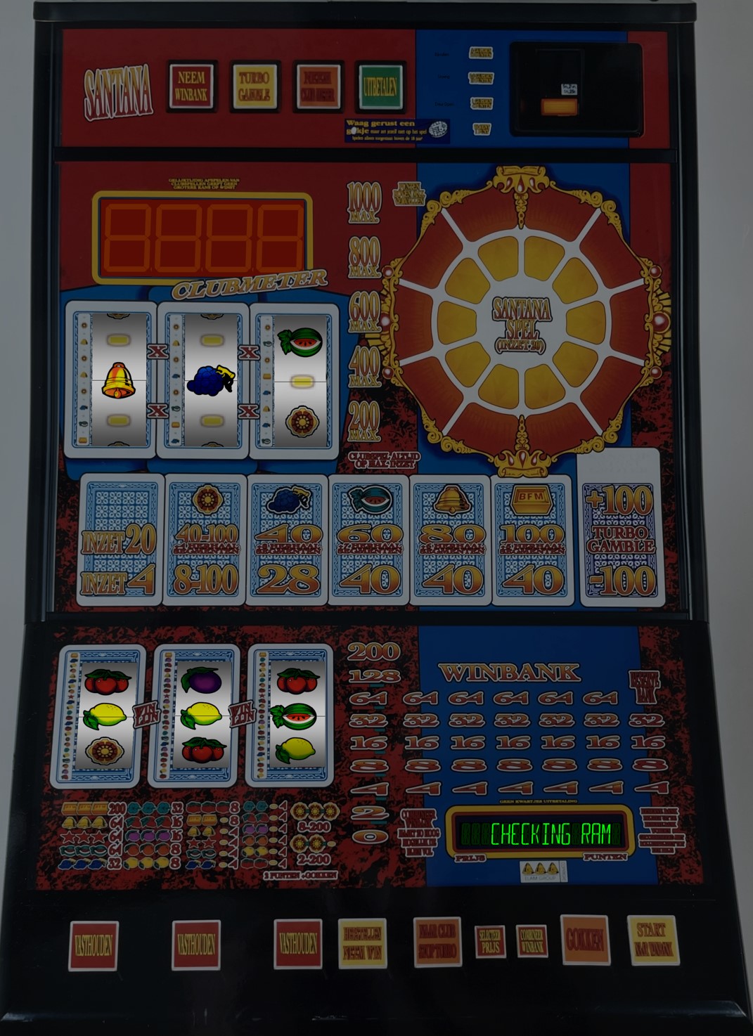 De Santana is een fruitautomaat van Bell-Fruit uit 1993 in het BFM90-kabinet, met een uitgebreid spaar- en clubspel. In het basisspel geven fruitsymbolen prijzen; een speciaal symbool levert kris-kras een mysteryprijs op. Prijzen kunnen worden geïnd, gegokt via de gamble ladder, opgeslagen op de spaarkaart of overgezet naar de Clubmeter. Op de spaarkaart kunnen prijzen tot 64 punten worden opgespaard en gecombineerd tot hogere waarden. Maximaal vijf gelijke prijzen kunnen tegelijk naar de Clubmeter worden verplaatst. De Clubmeter kan oplopen tot 200 per ingezette prijs, met een maximum van 1000. Het Clubspel wordt gespeeld met inzet 4 of 20. Bij…