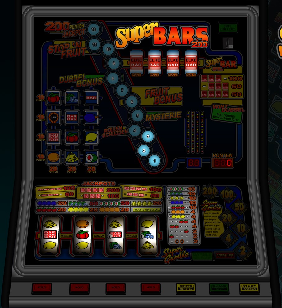Super Bars is een 4-rollen fruitautomaat waarbij sommige symbolen de cijfers 1 t/m 3 bevatten om het featurespel op te bouwen. Wins lopen van 2 tot 20 bonuspunten (200). Gamble / Super Gamble:Wins kunnen worden genomen of gegokt tot maximaal 20 bonuspunten. Met Super Gamble kan de gokstap groter worden (bijv. 2 → 10). Rollen schudden:Geeft een gratis spin waarbij de rollen willekeurig draaien. Mystery:Lampen lopen willekeurig; door te stoppen wint de speler een feature of prijs. Fruitbonus:Symbolen op de winlijn vullen de fruitkaart. 3 horizontaal = 1 bonuspunt (10) 4 verticaal = 2 bonuspunten (20)Blijft actief tot een win…