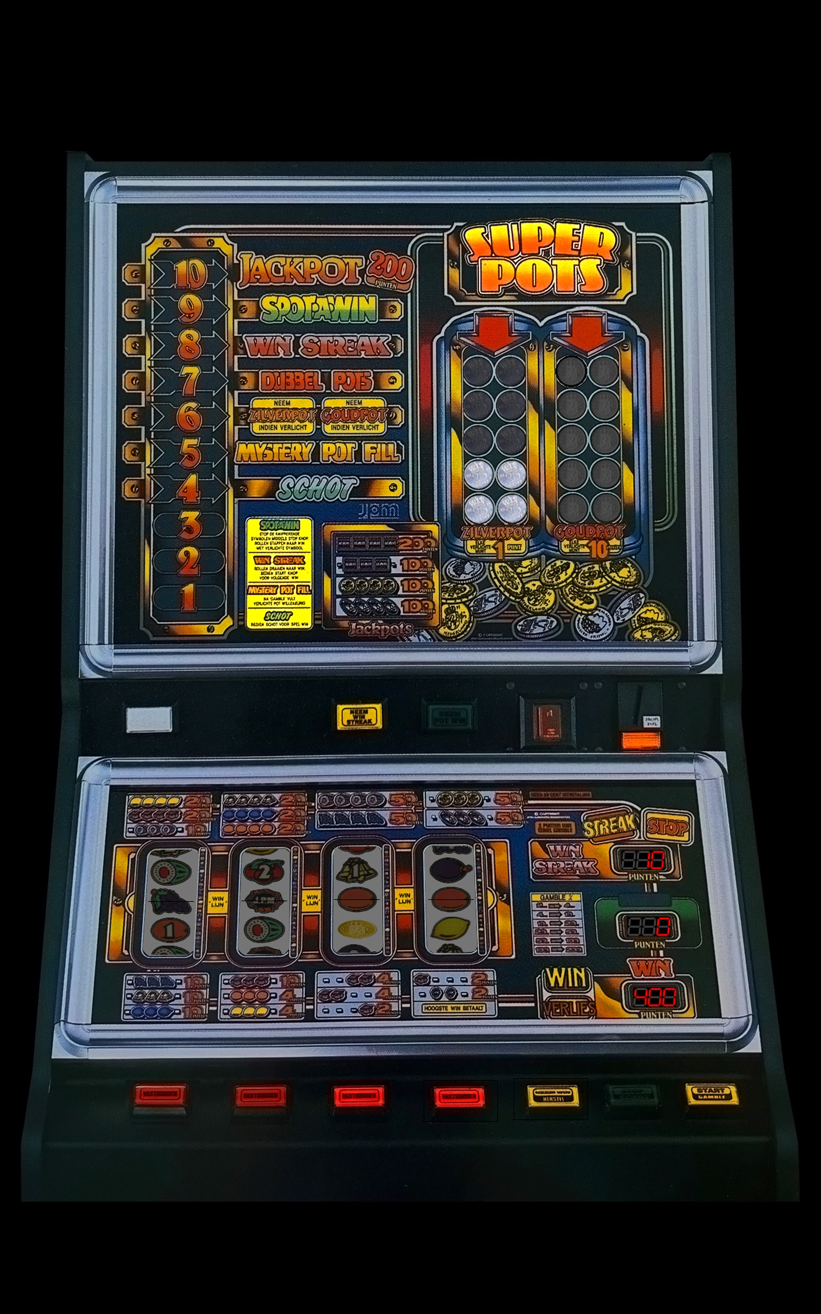 Super Pots heeft vier rollen met klassieke fruitsymbolen. Winnende combinaties geven recht op vrije spelen of bonusspelen, variĆ«rend van 2 free spins tot 20 bonusspelen (200 punten). Symbolen met cijfers (1 t/m 3) en pijlen bouwen het spel op in de bovenruit. Belangrijkste functies GambleWin opnemen of verdubbelen tot max. 200 punten.Bij opname of succesvolle gamble vervalt het opgebouwde spel. Schot (4)Mogelijkheid om via de schottoets naar een hoger nummer te schieten. Mystery Pot Fill (5)Gamble tussen zilver- en goudpot, die willekeurig worden gevuld. Zilver- en Goudpot (6)1e keer: zilverpot2e keer: goudpot3e keer: beide pottenUitbetaling tot max. 200 punten. Dubbelpots…