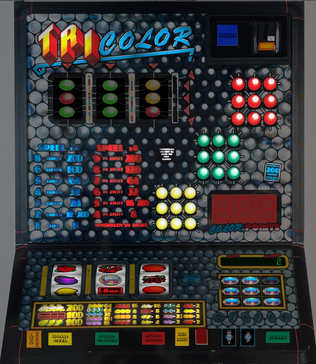 De Tri Color is een fruitautomaat van Barcrest uit 1990, uitgebracht in het Vantage-kabinet met MPU4-techniek. Het spel bestaat uit een 3-rollen basisspel, waarbij gewonnen punten kunnen worden ingezet in twee extra 3-rollen winpuntenspelen. De speler kan winsten innen, gokken of inzetten in een winpuntenspel. Op de bovenste rollen staan drie gekleurde symbolen.Bij x4 zijn 8 winlijnen actief en kan op één of twee kleuren worden gespeeld.Bij x8 wint de speler bij minimaal vier gelijke kleuren in beeld; spelen met twee kleuren verdubbelt de inzet. Op de basisrollen vullen Match-It-symbolen een matrix. Is deze vol, dan draaien rol A, B…